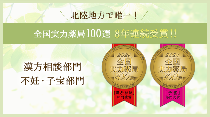 全国実力薬局100選では、北陸地方で唯一の「不妊・子宝」部門と「漢方相談」部門の両部門で8年連続受賞しています。