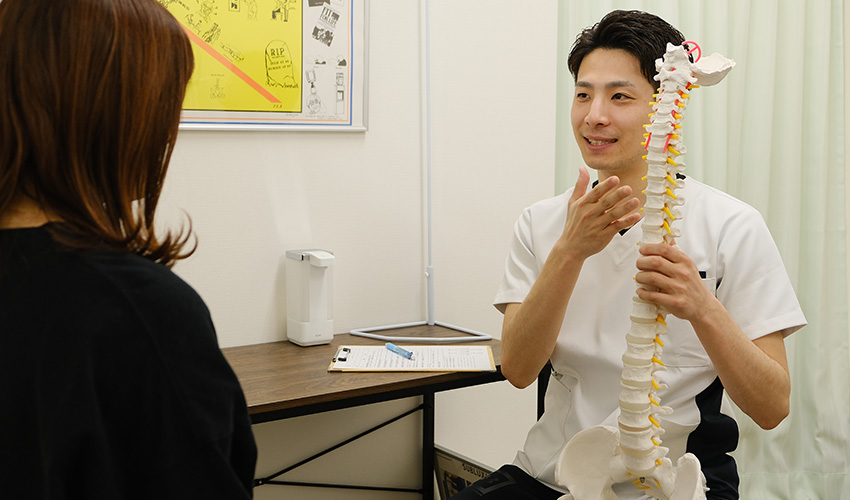 患者の症状や生活習慣に関する細かな質問を行い、問診を通じて、患者の痛みや不調の原因を特定し、治療計画を立てていきます。