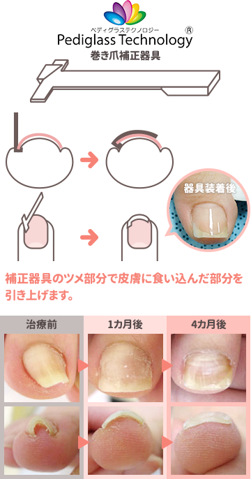 名古屋巻き爪ケア専門院 天白店では、ペディグラス・テクノロジー®という国内・国際特許取得した様々な爪に対応できる矯正技術と補正器具を使い治療を行います。