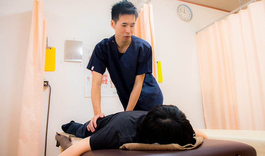 施術は、病院や接骨院で使うような電療器具に頼らず、手で行う施術(マッサージを含む)と運動療法を中心に組み立てます。