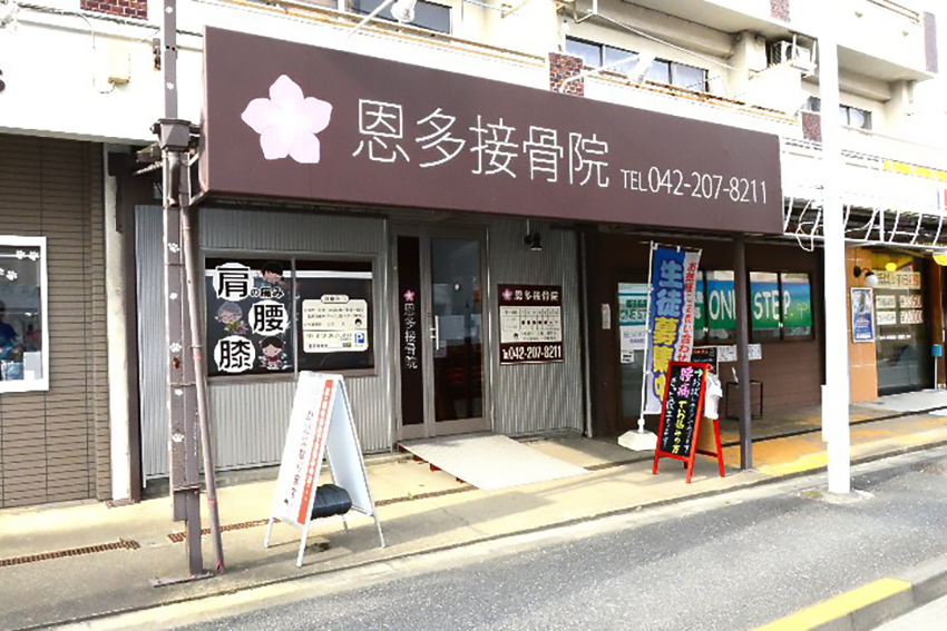西武バス「恩多辻」停から徒歩30秒という近さに加え、敷地横に無料駐車場の案内があり、バスでお越しの方や車の方など、痛みが強い時期の遠回りや歩き直しを避けたいという方には嬉しい環境です。